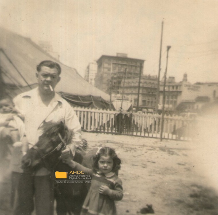 Fotografía, Montevideo, un hombre y dos niños junto a un caballo, 1950